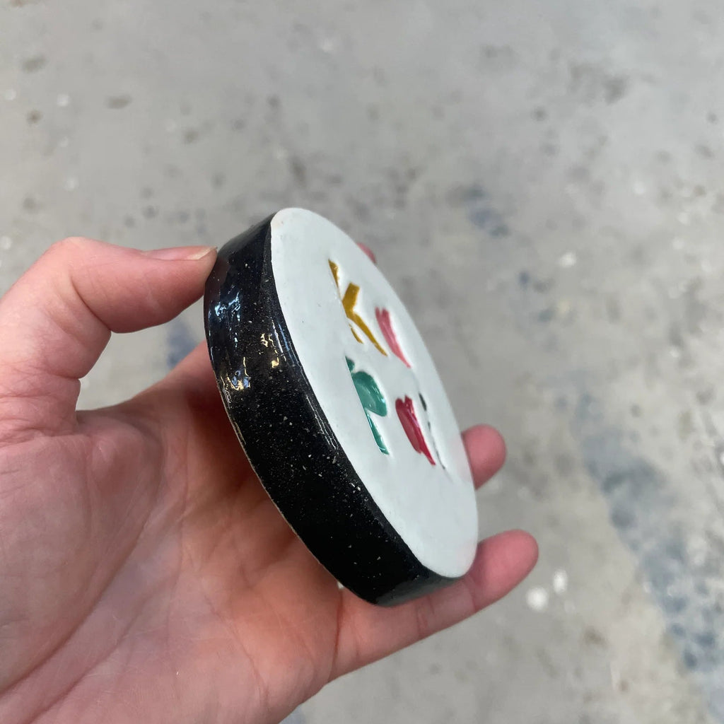 Approximate Sizes 90mm round. 15mm deep.This tile may be slightly uneven in shape due to the tile itself being entirely handmade.